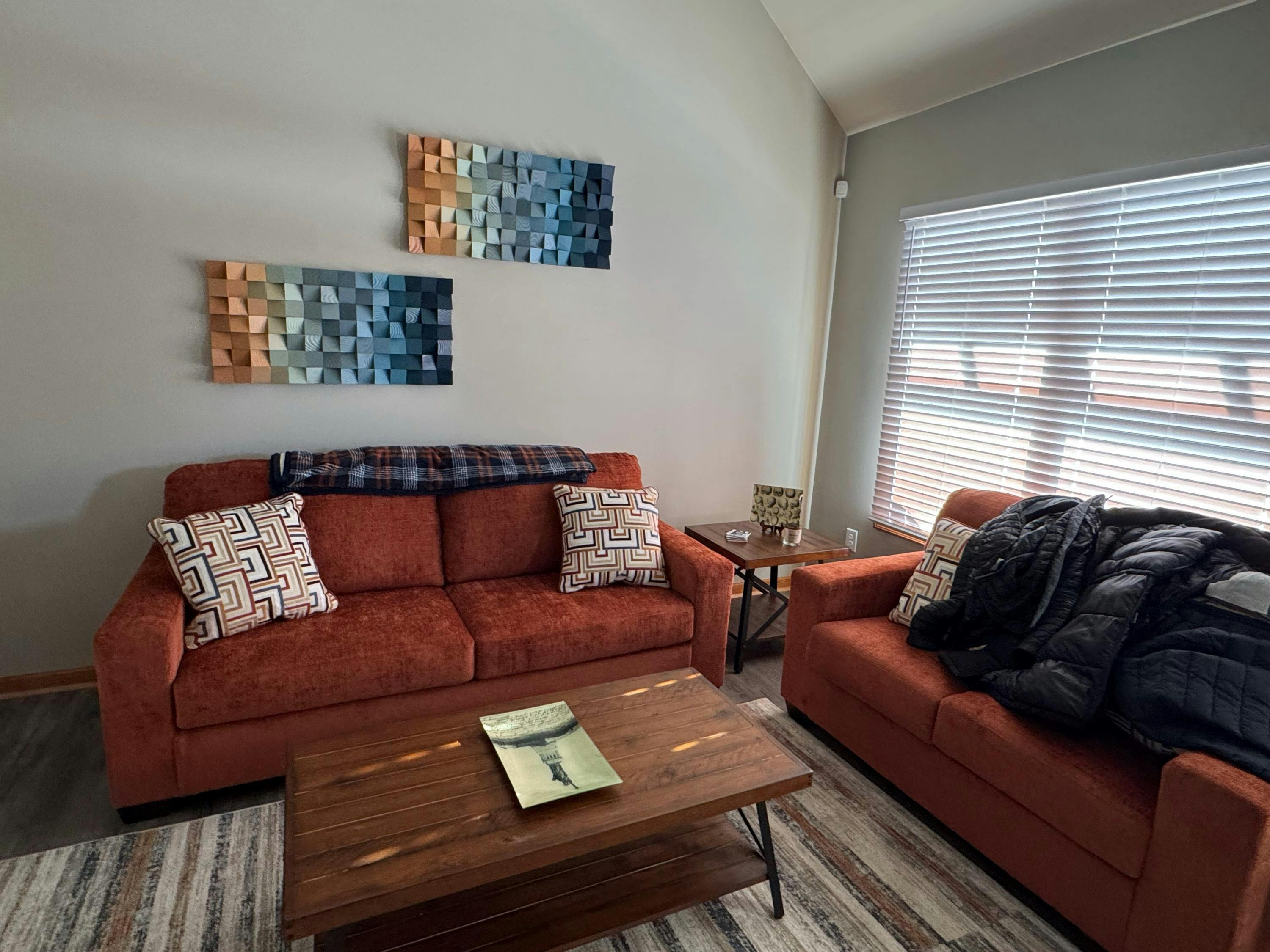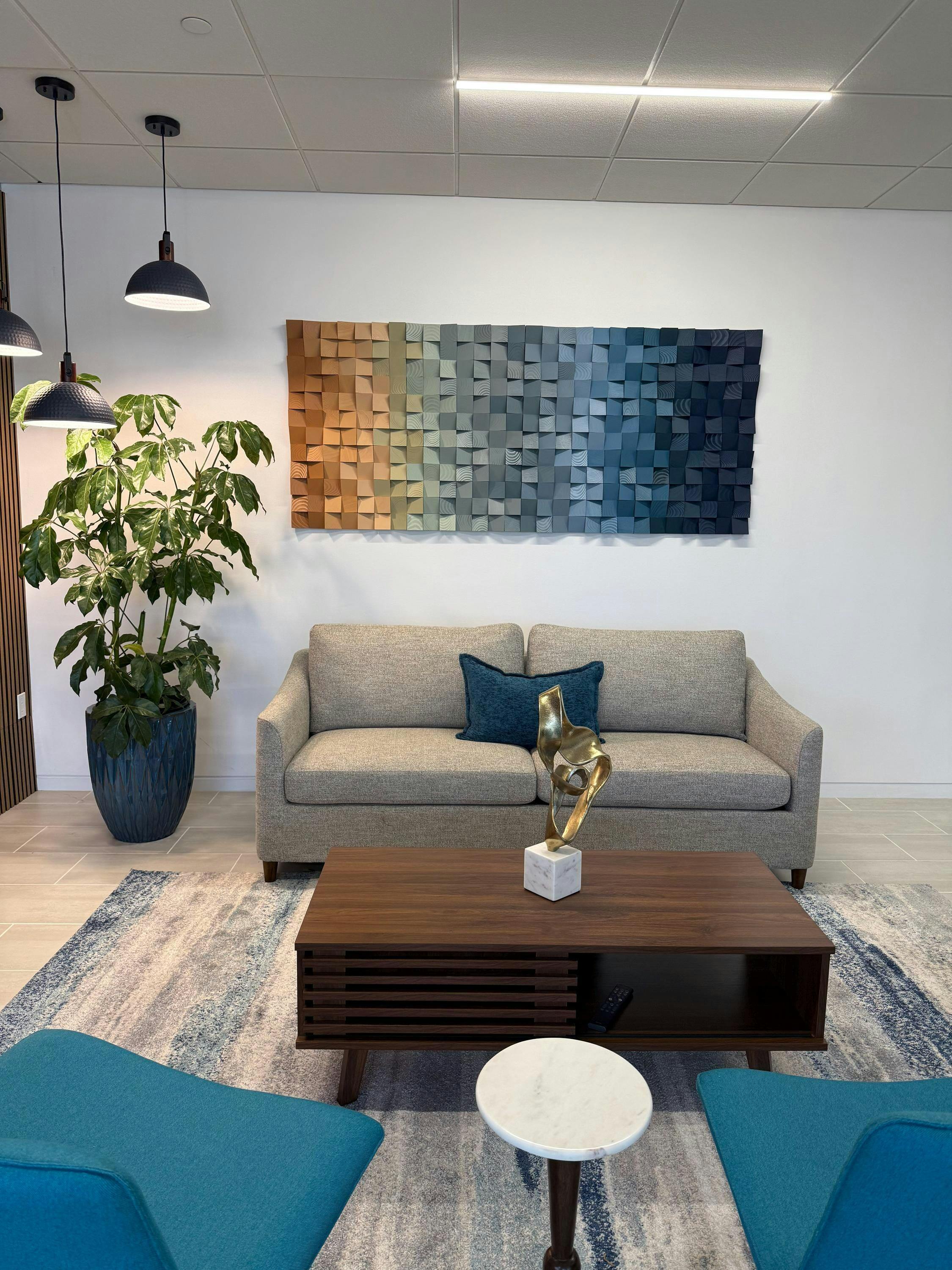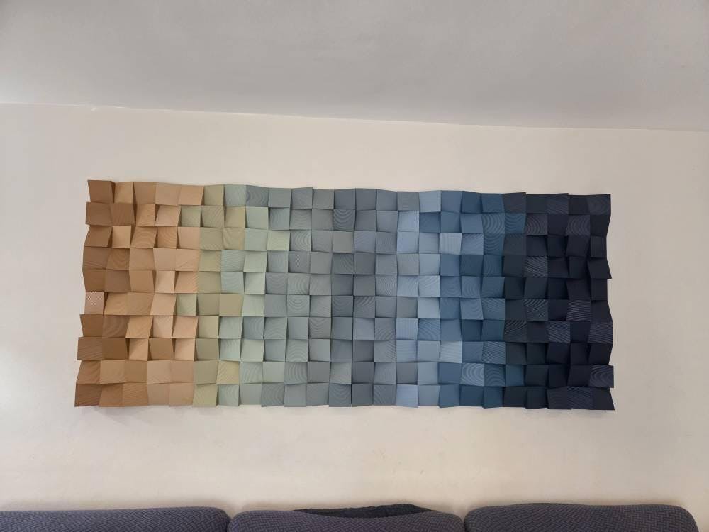 Thanks, Akiva! We love our new wall hanging (feels like an art installation)! The colors ended being perfect—and I love the textural aspect of this piece! It's perfect in our dining room (although I could have put it in several other places!). I appreciated the sample pieces of wood showing me the exact shades of the colors. They really helped me to see that the colors would work. Stunning!