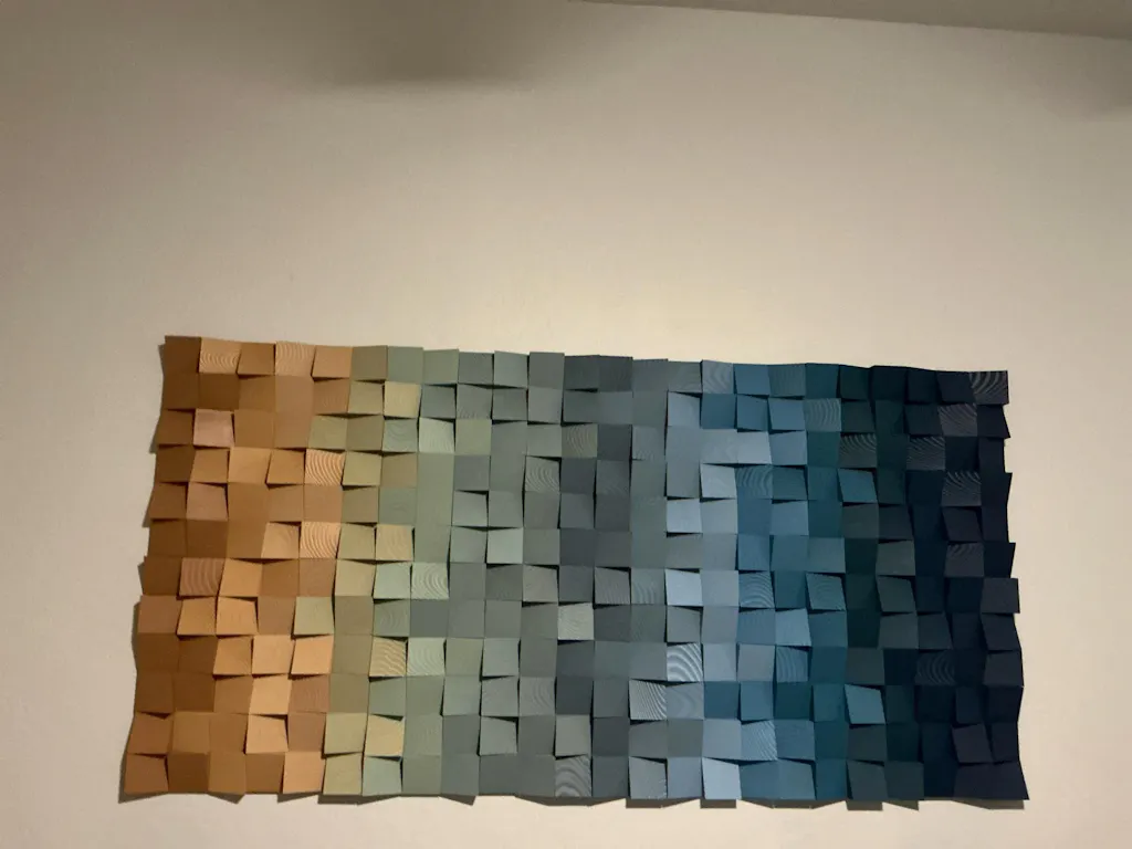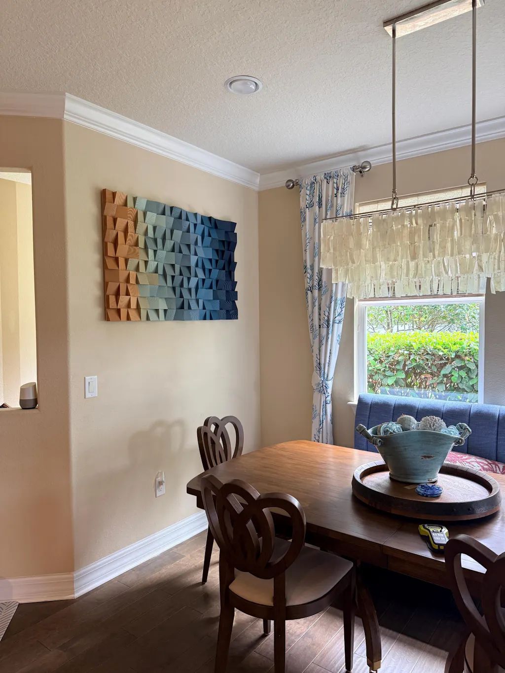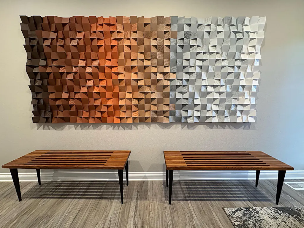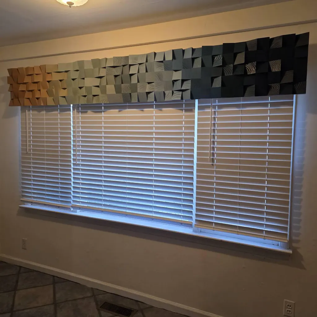 This piece of art is absolutely stunning! It is well made and looks even more impressive in person than the photo (it's 9' wide)! Packaging was also fantastic....no damage from Nevada to Ohio...it's all due to how carefully the artist packaged it. I highly recommend doing business with them.